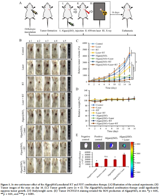 2.治療機制:Algae@SiO?通過光合產(chǎn)氧增敏放療,并利用葉綠素實現(xiàn)PDT,形成協(xié)同抗腫瘤效應。