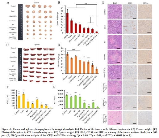 聯(lián)合治療組(Algae@SiO?+激光+RT)腫瘤體積抑制>90%(圖5C),HIF-1α表達降低(圖6G),肺轉(zhuǎn)移完全抑制(圖7)。