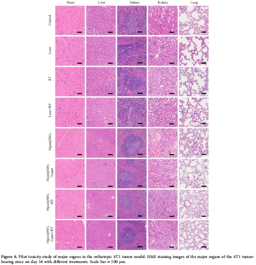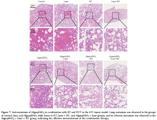 協(xié)同療效:在4T1乳腺癌模型中,Algae@SiO?聯(lián)合650 nm激光和X射線(6 Gy)顯著抑制腫瘤生長(90%以上)并減少肺轉(zhuǎn)移(圖5-7)。