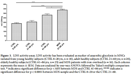 數(shù)據(jù):MDS的LDH活性(337±9.6 mU/mg)顯著高于年輕對(duì)照組(188.5±8.7),甚至高于老年組(281.7±13.4)。