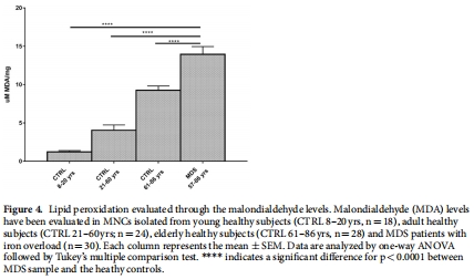 數(shù)據(jù):MDS的MDA水平(13.9±1 μM/mg)遠(yuǎn)高于老年對(duì)照組(9.3±0.6),且與血清鐵蛋白正相關(guān)(r=0.8)。