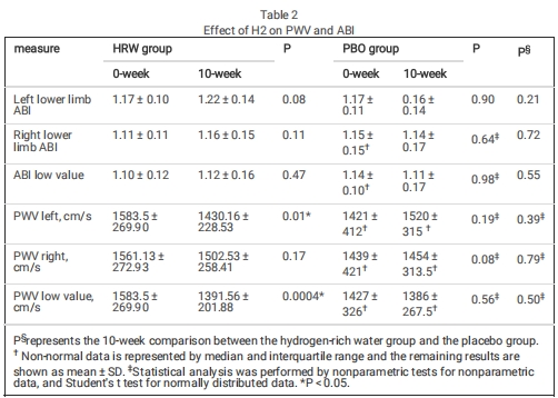 論文摘要指出:吸煙、高血壓、高脂血癥和糖尿病會增加周圍動脈疾病(PAD)風險,這些因素通過激活自由基、引發炎癥和氧化應激導致內皮功能障礙。研究通過隨機對照試驗(RCT)驗證富氫水(HRW)對PAD高風險人群的作用,發現: