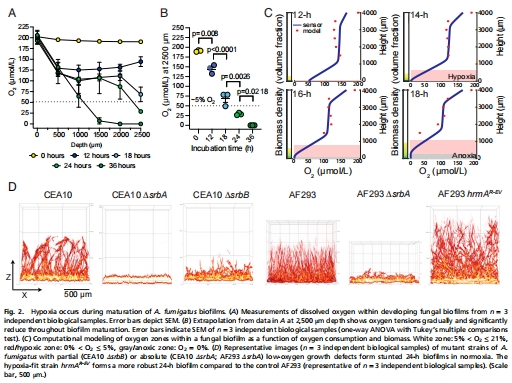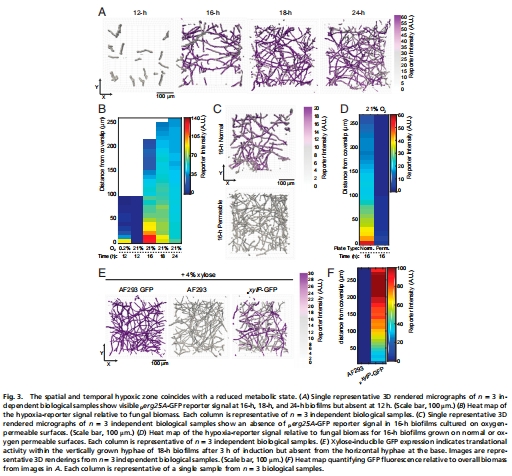 生物膜的垂直菌絲結構消耗氧氣,導致基底缺氧(圖1D);
