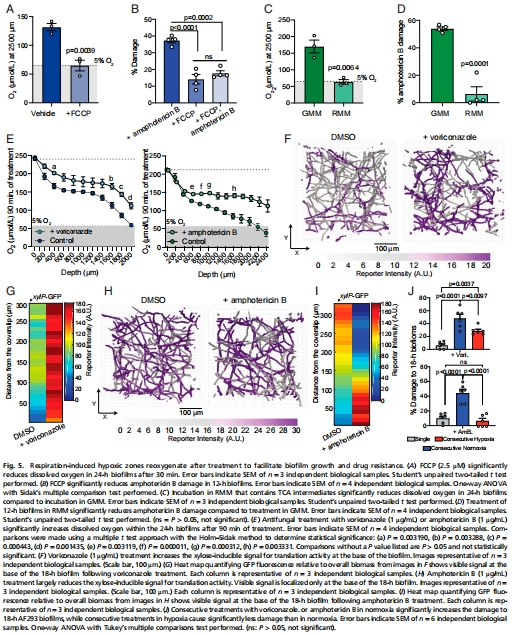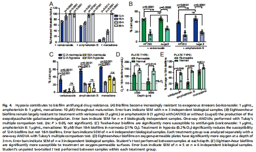 核心發現:煙曲霉(Aspergillus fumigatus)生物膜在成熟過程中自發形成缺氧微環境(圖2),這種缺氧狀態驅動生物膜對抗真菌藥物(如伏立康唑、兩性霉素B)產生耐藥性(圖4)。