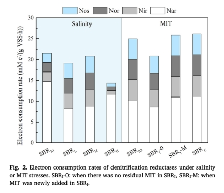 3 電子消耗速率(Nar、Nir、Nor、Nos):量化鹽度對反硝化各步驟的抑制程度。數據來自圖2。