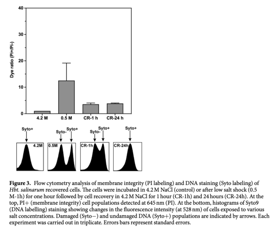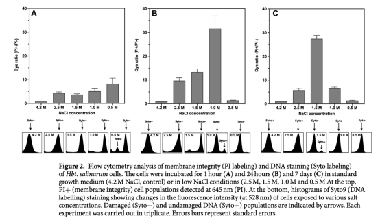 將Halobacterium salinarum置于不同低鹽條件(2.5 M至0.5 M NaCl)下處理不同時(shí)間(1小時(shí)、24小時(shí)、7天),然后轉(zhuǎn)移回生理鹽濃度(4.2 M NaCl)進(jìn)行恢復(fù);通過測(cè)量細(xì)胞生長(zhǎng)、膜完整性(流式細(xì)胞術(shù))、呼吸活性(氧消耗)、細(xì)胞形態(tài)(顯微鏡觀察)和蛋白質(zhì)組分子動(dòng)力學(xué)(中子散射),綜合分析其應(yīng)激響應(yīng)和恢復(fù)過程。