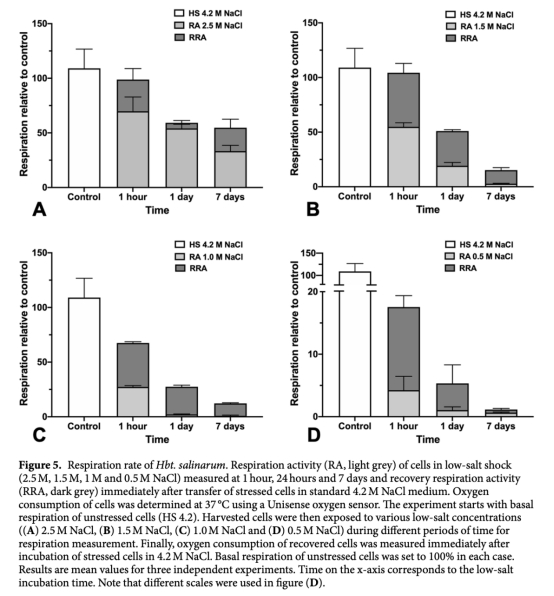 使用丹麥Unisense微氧電極測(cè)量的呼吸活性數(shù)據(jù)(圖5)直接反映了細(xì)胞能量代謝狀態(tài)。數(shù)據(jù)顯示,低鹽條件下呼吸速率顯著下降(尤其是低于1.5 M NaCl及長(zhǎng)時(shí)間暴露),但一旦轉(zhuǎn)移回高鹽條件,呼吸活性立即恢復(fù)(甚至 after 7 days at 0.5 M NaCl)。這表明即使經(jīng)歷極端低鹽壓力,部分細(xì)胞仍保留完整的呼吸鏈和離子泵功能,能夠快速重啟能量生產(chǎn),為蛋白質(zhì)修復(fù)、分子伴侶作用和離子穩(wěn)態(tài)恢復(fù)提供能量基礎(chǔ)。這些數(shù)據(jù)證實(shí)了細(xì)胞在低鹽應(yīng)激下仍維持基本代謝能力,并突顯其恢復(fù)的迅速性和高效性,對(duì)理解嗜鹽古菌在鹽度波動(dòng)環(huán)境中的生存策略至關(guān)重要。