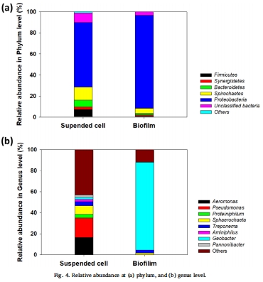 數(shù)據(jù)來源:圖4 顯示了生物膜和懸浮細胞在門水平和屬水平的群落組成。