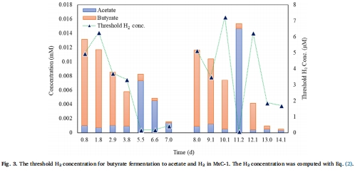研究意義:電流的產(chǎn)生與丁酸的消耗同步進行,并伴有異丁酸和乙酸的中間積累和降解。這為丁酸通過氧化產(chǎn)乙酸途徑降解提供了間接證據(jù),暗示了需要氫氣消耗者來維持低氫分壓,驅動熱力學反應。
