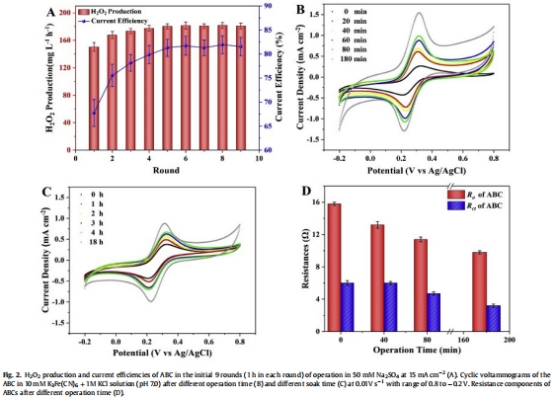 數據來源:圖2 展示了ABC陰極在初始多個運行輪次中的H?O?產率變化(A),以及在不同運行時間后的CV曲線(B)和電阻成分變化(D)。