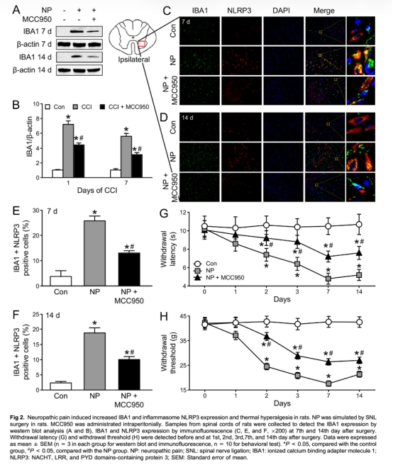 1 小膠質(zhì)細(xì)胞激活和NLRP3表達(dá)數(shù)據(jù)來自圖2。研究意義是證實神經(jīng)病理性疼痛激活小膠質(zhì)細(xì)胞和NLRP3炎癥小體,抑制NLRP3可減輕疼痛,說明炎癥小體在疼痛中起關(guān)鍵作用。
