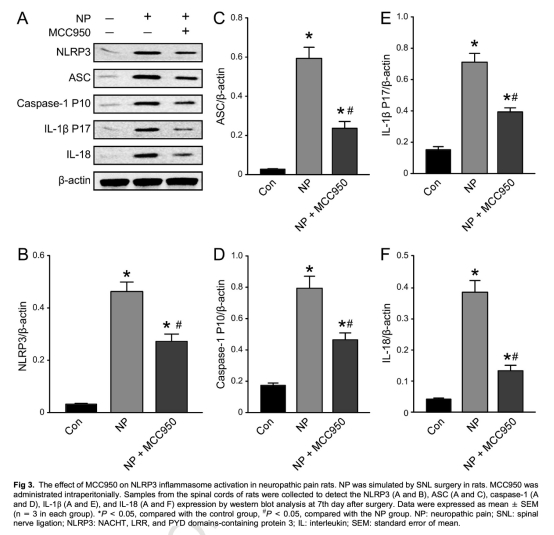 2 炎癥小體通路蛋白表達(dá)數(shù)據(jù)來自圖3。研究意義是顯示NLRP3、ASC、caspase-1、IL-1β和IL-18在疼痛模型中上調(diào),MCC950能抑制這些蛋白,驗證炎癥小體通路的完整性。