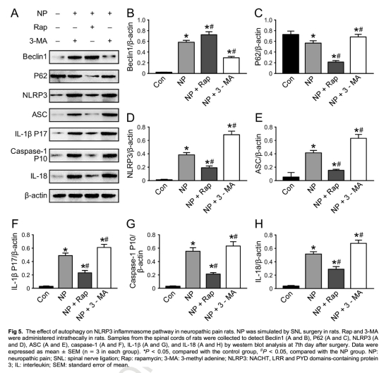 4 自噬相關(guān)蛋白表達(dá)數(shù)據(jù)來自圖5。研究意義是發(fā)現(xiàn)疼痛模型中Beclin1表達(dá)增加、P62減少,自噬激活可調(diào)節(jié)炎癥小體蛋白,揭示自噬與炎癥小體的相互作用。