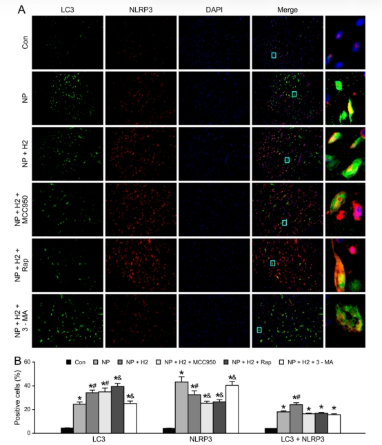6 LC3與NLRP3共定位數(shù)據(jù)來自圖7。研究意義是直觀顯示氫氣增加LC3陽性細(xì)胞、減少NLRP3陽性細(xì)胞,進(jìn)一步證實氫氣通過自噬抑制炎癥小體的細(xì)胞學(xué)基礎(chǔ)。