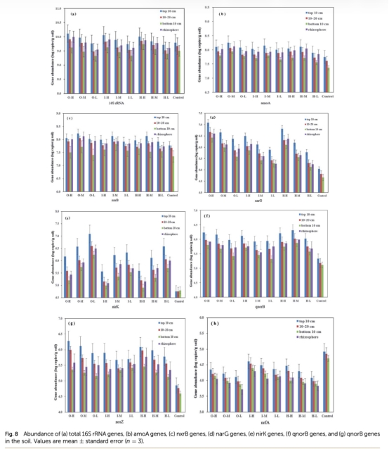 4 功能基因豐度(16S rRNA、amoA、nxrB、narG、nirK、qnorB、nosZ):來自圖8。研究意義:基因豐度在植物組高于對照組,且隨深度增加而降低,表明植物促進微生物豐度,表土基因豐度高支持反硝化在表土微環境中發生,指導生物滯留的微生物管理。