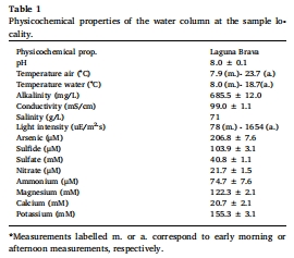 野外采樣與背景調(diào)查:在 Laguna Brava 特定地點(diǎn)采集具有層狀結(jié)構(gòu)的活體微生物墊,并測(cè)定水體的基本理化參數(shù)(Table 1)。