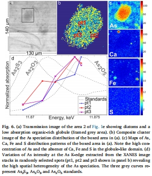 數(shù)據(jù):As(III) 和 As(V) 的分離圖譜,以及在一個(gè)有機(jī)質(zhì)球狀體(Figure 6)中高砷但缺乏其他金屬的信號(hào)。