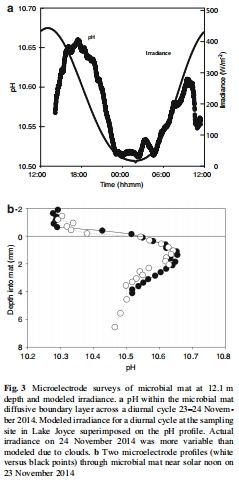 測量數據:在12米水深的微生物墊中,獲得了高分辨率(0.5毫米間隔)的pH垂直剖面(圖3b)以及在墊-水界面固定點進行的超過24小時的pH時序記錄(圖3a)。