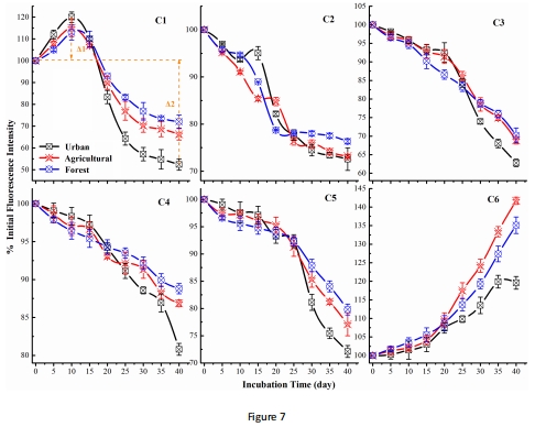 研究意義:動態揭示了不同來源/組成的DOM組分的生物降解優先級和轉化路徑。數據顯示類蛋白和類富里酸組分(C1, C3)優先被降解,而某些類腐殖質組分(C6)在培養后期反而增加,證明了微生物在轉化生成難降解DOM(微生物碳泵效應),且這種效應在農業和森林溪流中更強。