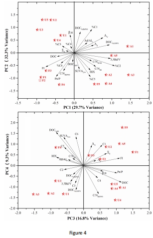 數據:SUVA254(芳香性)、PARAFAC組分C1-C6的Fmax值(C1: 類酪氨酸;C2: 微生物轉化類腐殖質;C3: 類富里酸/大氣沉積;C4, C5, C6: 陸源類腐殖質)、FI、HIX、β:α。