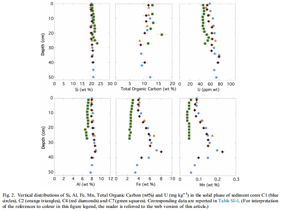 數據:Si、Al、Fe、Mn、總有機碳(TOC)和U在沉積物垂直剖面中的濃度變化。