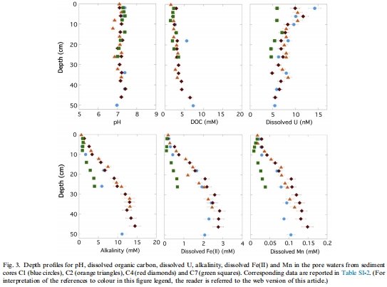 數據:pH、溶解有機碳(DOC)、溶解U、堿度、Fe(II)和Mn在孔隙水中的垂直分布。