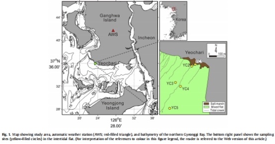 研究區域與采樣:選擇韓國慶州灣的鹽沼和混合平坦區作為研究點(圖1),在三種天氣條件(無雨、降雨、雨后)下采集表層沉積物樣本。