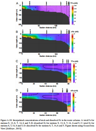 表征Fe運輸路徑:確定Fe從沿海到深盆的橫向運輸形式(溶解、膠體、顆粒)和動力學。