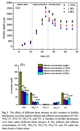 數(shù)據(jù):DO隨生物膜深度增加而降低(如1.4 Pa下,表層1.96 mg/L降至底層0.09 mg/L);NH??濃度遞減;NO??在低剪切下遞減,但在2.0 Pa下遞增;NO??在深層積累。