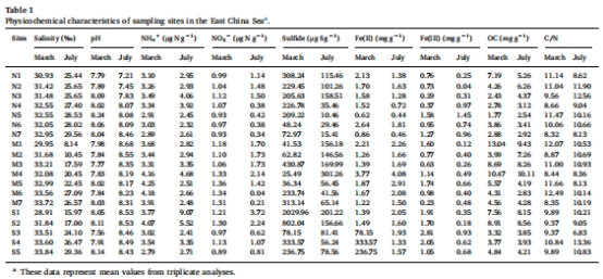 數(shù)據(jù)內(nèi)容:溫度(3月5.1–12.6°C,7月19.4–23.9°C)、鹽度(3月28.9–33.8‰,7月8.1–29.6‰)、硫化物(3月25.49–2029.96 μg S g?1,7月10.46–301.26 μg S g?1)、Fe(II)(0.44–4.08 mg g?1)、Fe(III)(0.04–2.81 mg g?1)、有機(jī)碳(1.77–13.04 mg g?1)、C/N比(6.83–13.36)。