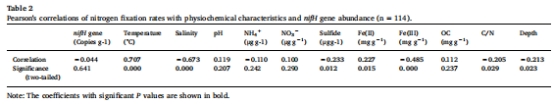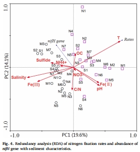 數(shù)據(jù)內(nèi)容:氮固定率與溫度正相關(guān)(r=0.707, p<0.01)、與鹽度負(fù)相關(guān)(r=-0.673, p<0.01)、與硫化物負(fù)相關(guān)(r=-0.233, p<0.05)、與Fe(II)正相關(guān)(r=0.227, p<0.05)、與C/N比負(fù)相關(guān)(r=-0.205, p<0.05);RDA分析顯示環(huán)境因子解釋33.7%變異(Fig. 4)。