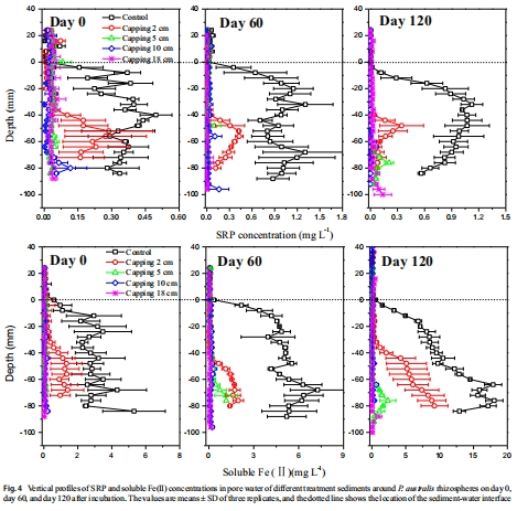 數(shù)據(jù)內(nèi)容:SRP和Fe(II)濃度在沉積物表層(0-30 mm)呈現(xiàn)峰值分布;覆蓋處理中SRP濃度短期下降,但120天后顯著升高(如2 cm覆蓋處理SRP從~2 mg L?1增至~4 mg L?1)。