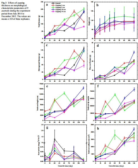 數(shù)據(jù)內(nèi)容:蘆葦總生物量、根長、根表面積等指標(biāo)隨覆蓋厚度增加而升高(如18 cm覆蓋處理生物量最高);根活性在實(shí)驗(yàn)后期下降。
