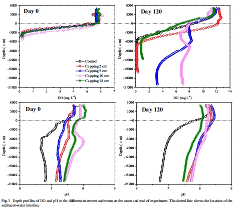 時(shí)空動態(tài):實(shí)驗(yàn)初期和末期對比(Fig. 1),顯示覆蓋處理下DO和pH的演變。