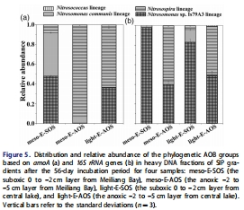 數據內容:13C標記的amoA基因在CsCl梯度“重”分數中富集,表明自養活性;AOA在中等富營養化缺氧層標記較少,AOB在輕度富營養化低氧層標記較少。