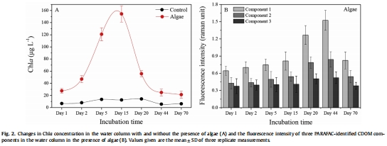 數(shù)據(jù)內(nèi)容:Chla濃度在藻華處理中從第1天27.6 μg L?1增至第15天154.3 μg L?1,之后下降至第70天14.3 μg L?1;CDOM組分(如色氨酸類熒光團(tuán))在崩潰期增加。