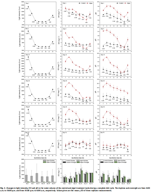 數(shù)據(jù)內(nèi)容:光強(qiáng)、DO和pH呈現(xiàn)晝夜波動(dòng),DO白天高(峰值13.3 mg L?1)、夜間低(最低1.5 mg L?1),pH白天高(峰值10.53)、夜間低。