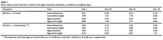 數(shù)據(jù)內(nèi)容:藻華處理中,表層沉積物(0至-2.5 mm)pH白天高(9.26)、夜間低(7.36),DO白天高(6.74 mg L?1)、夜間低(0.84 mg L?1);受影響深度達(dá)-20 mm(pH)和-3.5 mm(DO)。