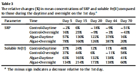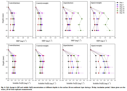 數(shù)據(jù)內(nèi)容:藻華處理中SRP和可溶性Fe(II)濃度增加,第44天SRP最大增加387%(夜間),第15天可溶性Fe(II)最大增加214%(夜間);夜間濃度普遍高于白天。