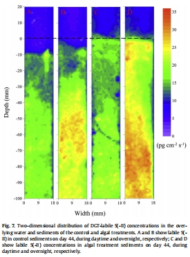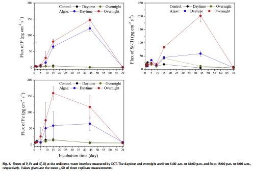 數(shù)據(jù)內(nèi)容:藻華處理中P、Fe和S(-II)通量增加,第44天通量最高,夜間通量一般高于白天。
