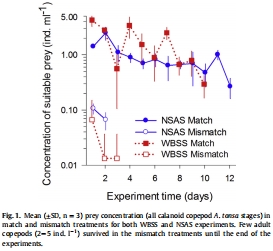 數(shù)據(jù):匹配處理保持高獵物濃度(~5 ind ml?1),不匹配處理在2-4天內(nèi)降至近零。