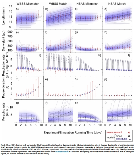 數(shù)據(jù):IBM成功復(fù)現(xiàn)實驗趨勢(如體長、體重、PD、Rs),預(yù)測較大幼體(25 mm)比較小幼體(12 mm)存活時間更長(25-33%),升溫減少存活時間。