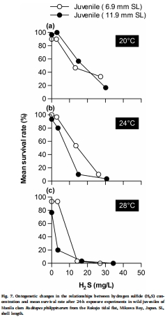 Ontogenetic and temperature-dependent changes in tolerance to hypoxia and hydrogen sulfide during the early life stages of the Manila clam Ruditapes philippinarum