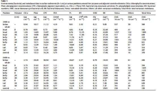 數據:包括沉積物中的葉綠素a、脫鎂葉綠素(指示 phytodetrital matter)、磷脂(指示總微生物生物量)、細菌數量、細菌生物量以及細菌外酶活性(FDA)。