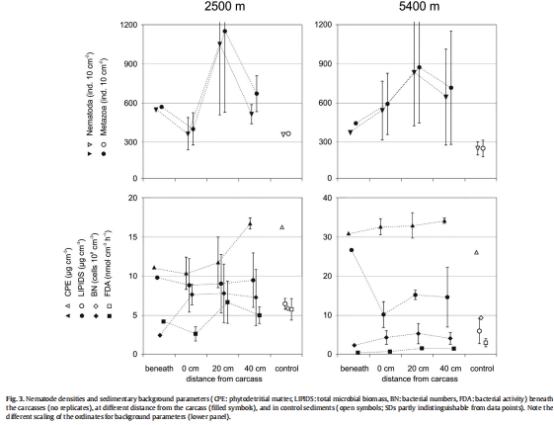 研究意義:數據顯示,在兩個水深,食物沉降點附近的線蟲密度均普遍高于對照點,且在20厘米距離處往往達到峰值。這直接支持了第二個假設,表明有機質輸入刺激了線蟲種群的繁殖或聚集。