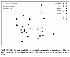 研究意義:非度量多維標度分析(NMDS,圖5)顯示,兩個水深的線蟲群落存在顯著差異。在2500米處,食物沉降點的線蟲多樣性(屬數)高于對照點;而在5400米處,差異不顯著。這表明食物沉降的影響因水深而異,較淺水深的群落響應更劇烈。