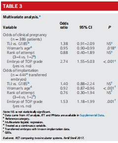 數據:分析了影響臨床妊娠和著床的獨立因素,包括培養箱類型、女性年齡、嘗試次數和移植胚胎質量。