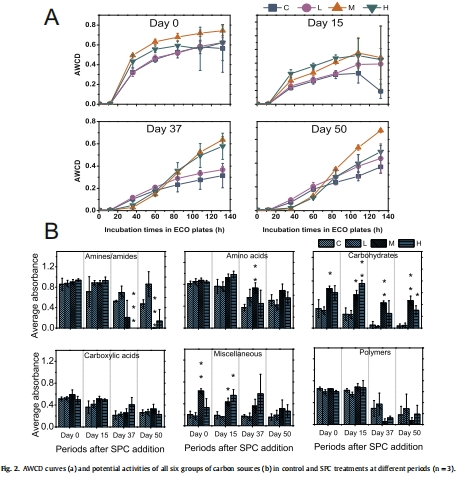 微生物代謝活性(數據來自Fig. 2a-b):數據:Fig. 2a顯示AWCD曲線,SPC處理組代謝活性高于對照;Fig. 2b顯示碳水化合物和雜項碳源組吸光度增加。研究意義:SPC增強微生物對多種碳源的利用,尤其是碳水化合物,表明代謝活性提升。