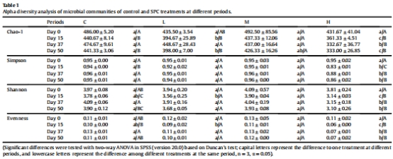Fig. 3E顯示發酵、化學異養等功能組增加。Table 1顯示高劑量SPC降低Chao-1和Shannon指數。