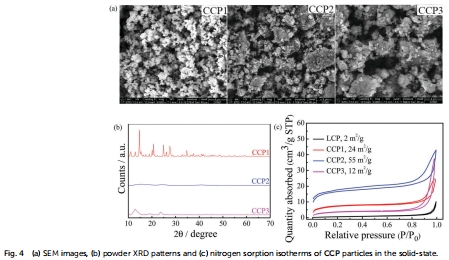 數據:Fig. 4a SEM顯示納米顆粒(50-200 nm),Fig. 4b XRD表明CCP1半結晶、CCP2無定形,Fig. 4c BET表面積CCP2最高(55 m2/g);Fig. 5 DSC無相變。